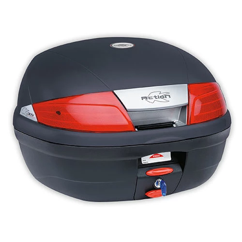 Bauletto lt. 35 nero goffrato con catadiottri rossi. Completo di piastra K628 Bauletto Monolock System® impermeabile, 35 lt. Sistema di apertura/chiusura automatico.