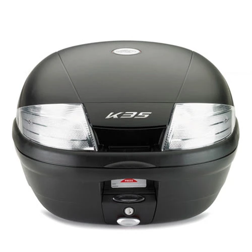 Bauletto lt. 35 nero goffrato con catadiottri trasparenti, completo di piastra K628 Versione del K35N con una coppia di catadiottri trasparenti e applicazione del logo KAPPA in versione cromata sulla parte posteriore. Restano invariate le caratteristiche tecniche del prodotto, che prevedono la capienza di 35 litri e la presenza del sistema automatico di apertura e chiusura. Il bauletto K35NT è disponibile solo nella versione nera.