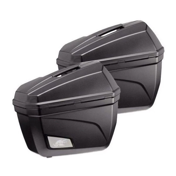 Coppia di valigie laterali nere goffrate Coppia di valigie laterali da 22 lt – Impermeabile – Apertura verticale del coperchio – Disponibile nella finitura nero goffrato – Compatibili con i sistemi di fissaggio tubolari KL e KLR